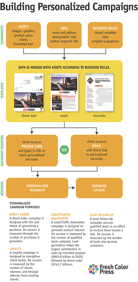 Personally relevant marketing that reaches people when they are most approachable While data-driven personalized direct mail is a powerful tool in its own right, it can produce even greater results used in conjunction with email and personalized web pages. A typical campaign begins by mailing personalized offers that include a visually-prominent PURL (a personalized URL created just for that person) directing recipients to web pages created specifically for them using database information about their past purchases and buying habits. Once there, people can immediately act upon offers, opt in for email marketing, request more information or call center follow-up, and/or provide additional information that can be used to create even more relevant future offers. The result is that cross-media campaigns enable marketers to move away from mass media “talk to” initiatives toward long-term dialog with customers and prospects.